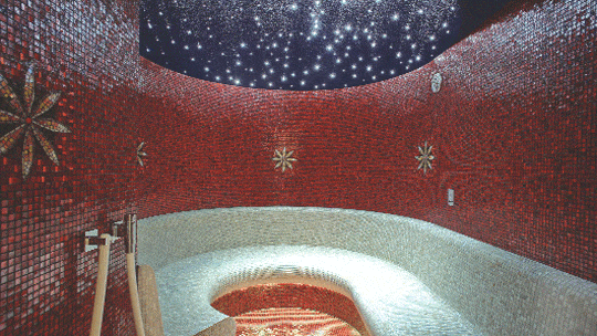 Wohl wichtigstes Gestaltungsmaterial war Mosaik. Die kleinen Steine finden sich in sandfarbenen Nuancen, teilweise mit Goldmosaik vermischt, an Wänden, Treppen, in den Duschbereichen und auf einer Sitzbank, davor präsentiert sich die weitere vorherrschende Farbe Rot bei einem Fußbecken. Außerdem zeigt sich der intensive Farbton noch in Ablagenischen, als Außenwand einer zweiten Dusche, im Dampfbad und bei einer auffälligen Hängelampe, die verspielte Lichteffekte auf die Wände des Spas zaubert.