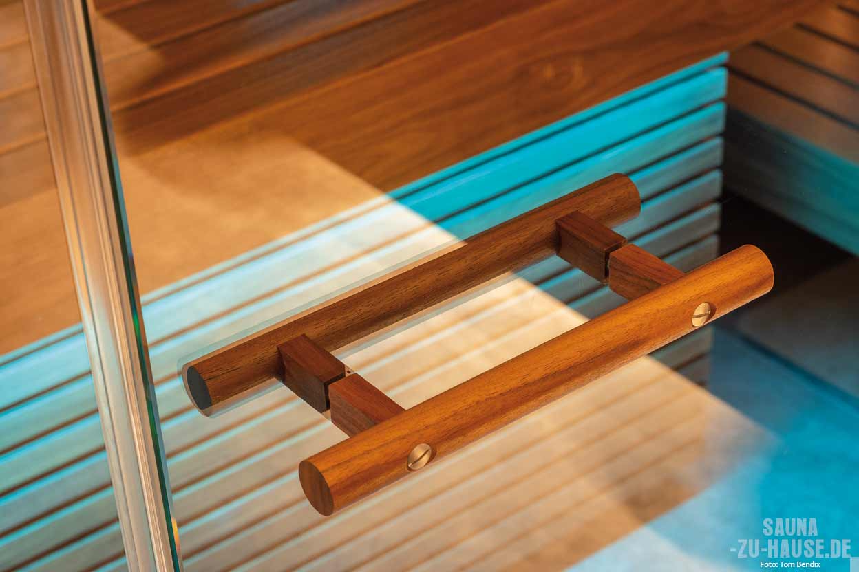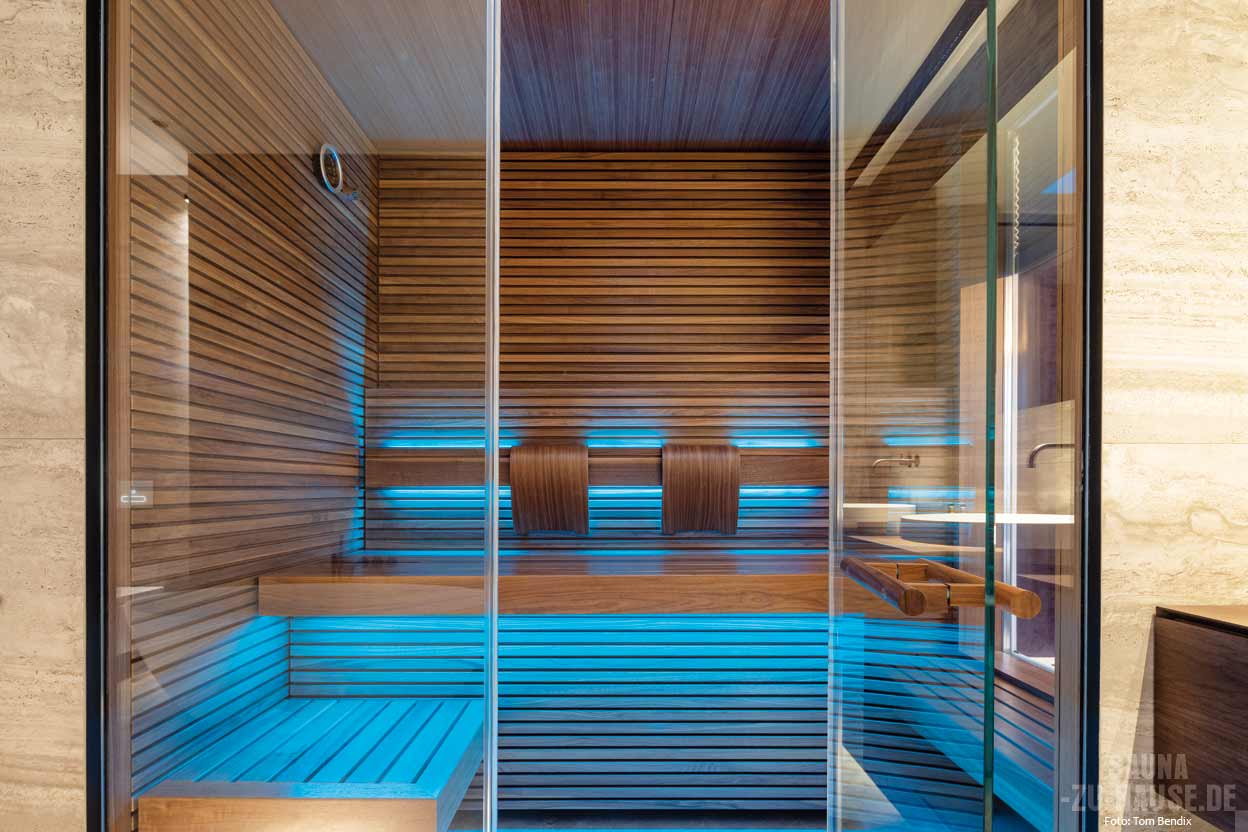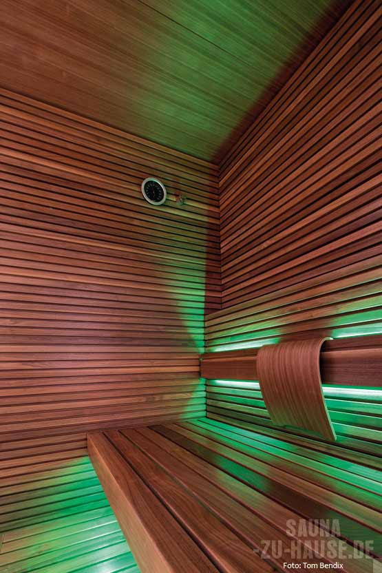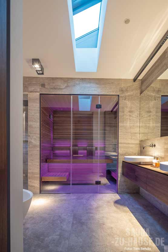 Zu diesem ruhigen, reduzierten Ambiente passt das Unterbankheizsystem mit dem Saunaofen Bonatherm, der unauffällig unter den Bänken angebracht ist. Der großflächige Luftaustritt bewirkt eine gleichmäßige Wärmeverteilung und ein angenehmes Klima. Ganzheitliche Entspannung können die Hausherren durch das „Sunset L RGB”-Beleuchtungssystem genießen, das hinter den Rückenlehnen und unter den Liegen verläuft. Die wechselnden Farbszenarien zaubern magische Lichteffekte.