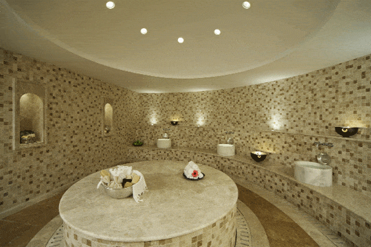 Alternativ können sich die Clubgäste in einem weiteren Wellnessbereich, dem zweiten Sanda Spa, verwöhnen lassen. Neben einer Sauna, einem Dampfraum und sieben Massageräumen, erwartet einen hier der Inbegriff der osmanischen Entspannungskultur: ein ganz in Weiß gehaltenes Hamam. Während der Badegast auf warmem Marmor liegt, reinigt und wäscht der Therapeut den Körper mit einem Luffaschwamm und führt danach eine klassische Schaummassage durch.