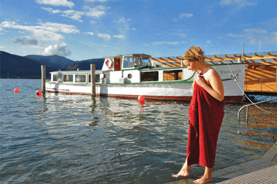 Aber nicht nur in Skandinavien kann man an Bord ins Schwitzen kommen, auch am beschaulichen Tegernsee in Oberbayern findet man ein Saunaschiff vor Anker, das zum „Monte Mare“-Hotel gehört. „Irmingard“, so der Name des Bootes, wurde 1925 gebaut und diente zuletzt im unweit entfernten Chiemsee angehenden Kapitänen zu Ausbildungszwecken. Seit August 2008 liegt „Irmingard“ nun im „Saunahafen“. Hier ist sie der Liebling der Gäste und wird als Saunaschiff genutzt. Darauf lässt sich nicht nur schwitzen und die Aussicht auf den See genießen – der leichte Wellengang hält das einmalige Saunaangebot ständig in Bewegung. Nach einem Saunagang im Heck des Schiffes widmen Sie sich im Bug, der „Kapitänskabine“, stilecht der Entspannung.