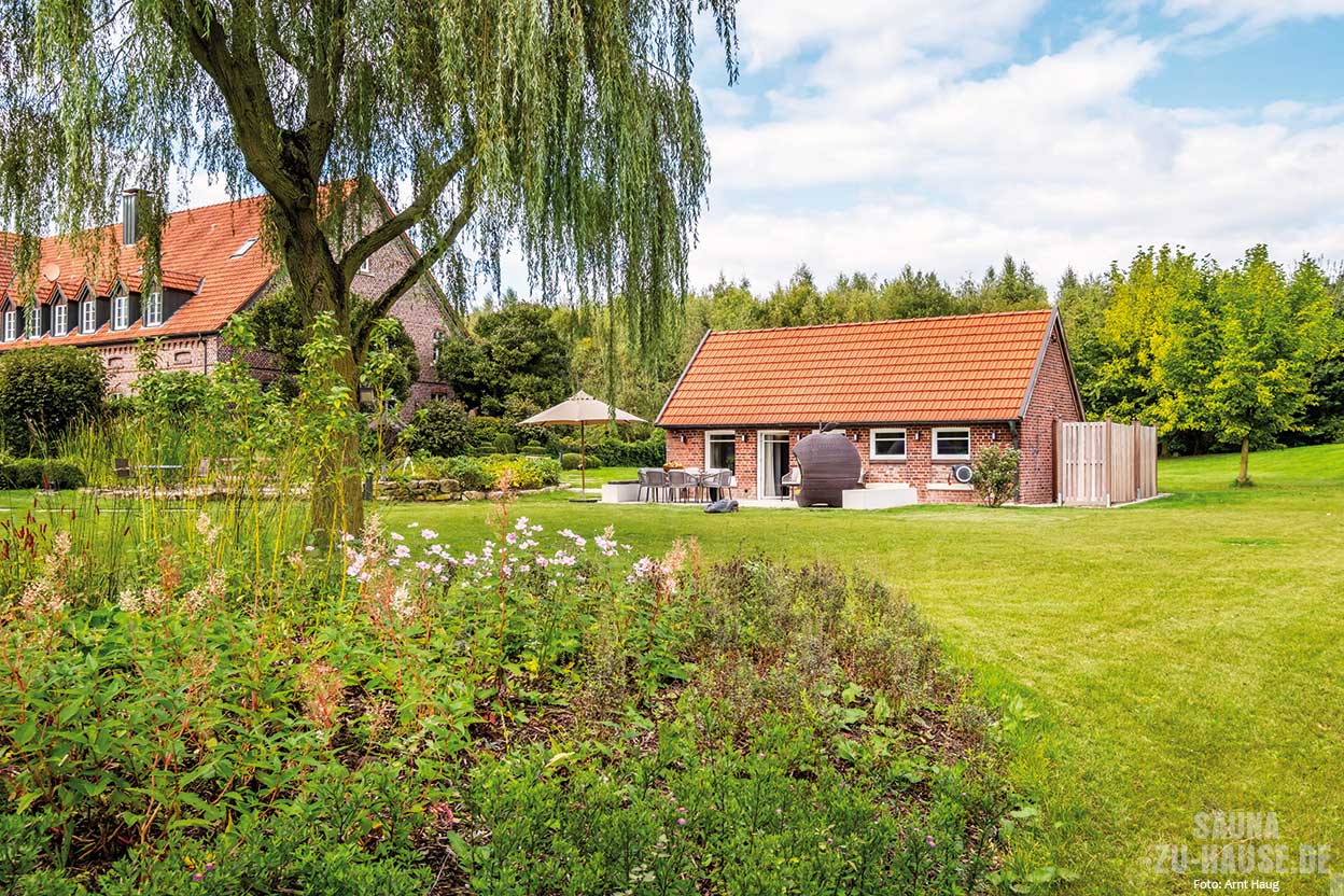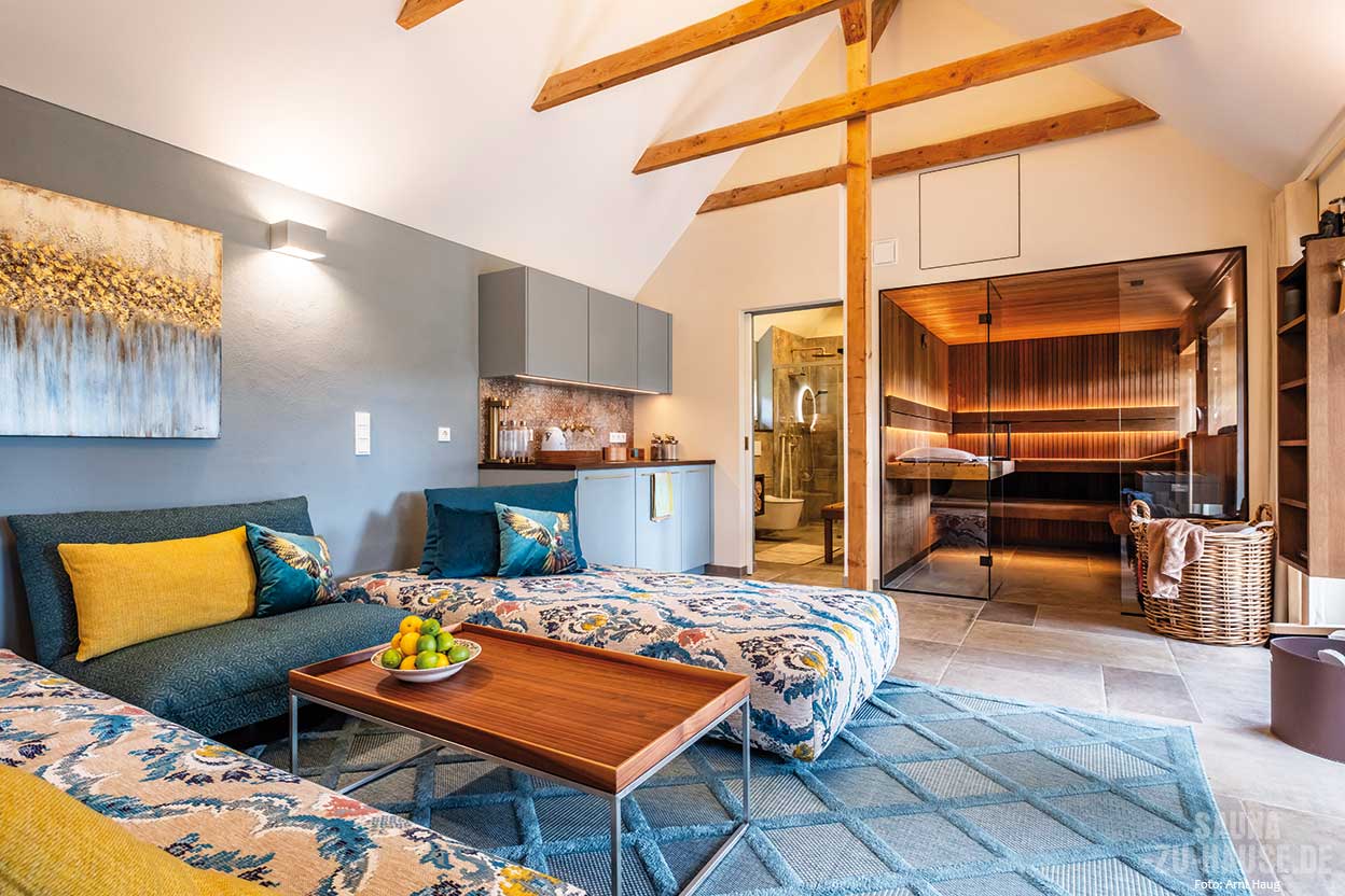 Ein Hauch von Meeresbrise mitten in Nordrhein-Westfalen – und das ausgerechnet in einem Gebäude, das einst ein baufälliger Hühnerstall war. Heute erinnert nichts mehr an das einsturzgefährdete Gemäuer. Statt Federvieh und morschem Holz empfängt einen nun ein luxuriöses Saunahaus, das zum Träumen und Entspannen einlädt. Die Bauherren, beruflich oft in der Welt unterwegs, wollten sich ein Refugium schaffen, das ihnen zu Hause ein Gefühl von Urlaub vermittelt. Ein Ort, an dem sie abschalten, sich regenerieren und neue Kraft tanken können.