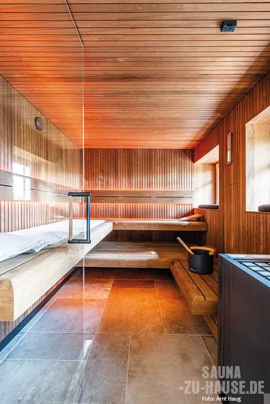 Die Sauna wird regelmäßig genutzt, besonders in den kühleren Monaten. Ein- bis dreimal pro Woche verwandelt sie sich wahlweise in eine klassische finnische Sauna oder in eine sanftere Biosauna mit Verdampferfunktion – ganz nach Stimmung und Bedürfnis. Und nicht nur die Bauherren genießen diesen privaten Luxus. Auch die erwachsenen Kinder greifen dankbar zum Bademantel, wenn sie zu Besuch sind.