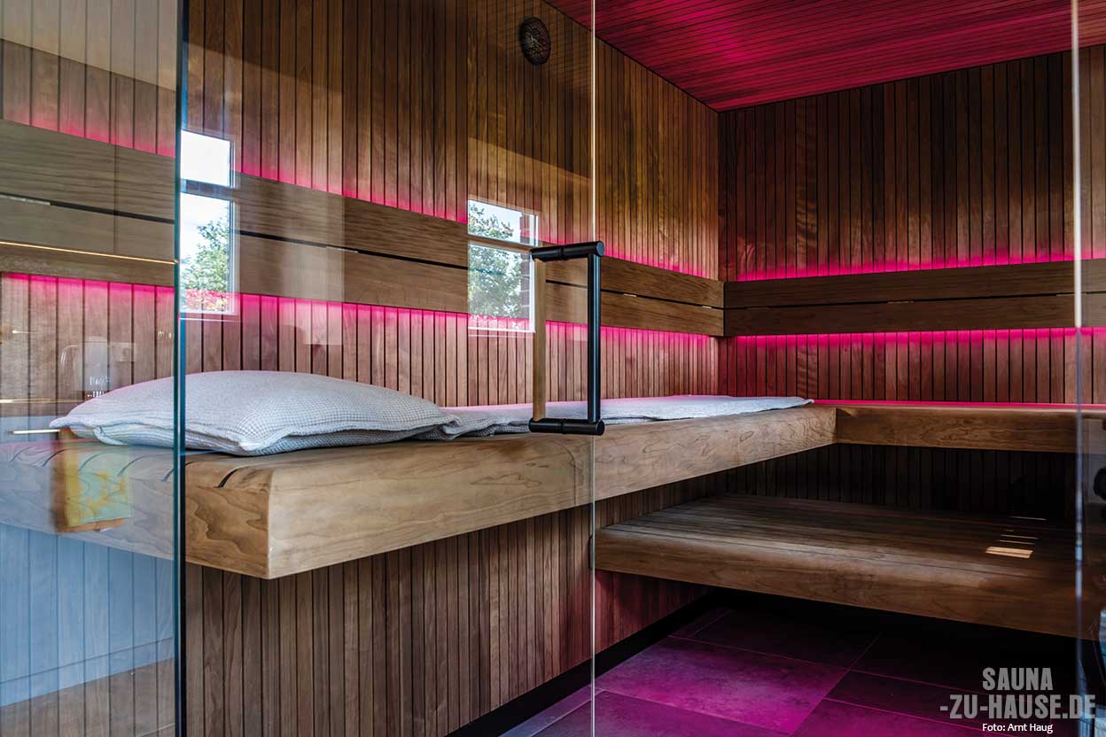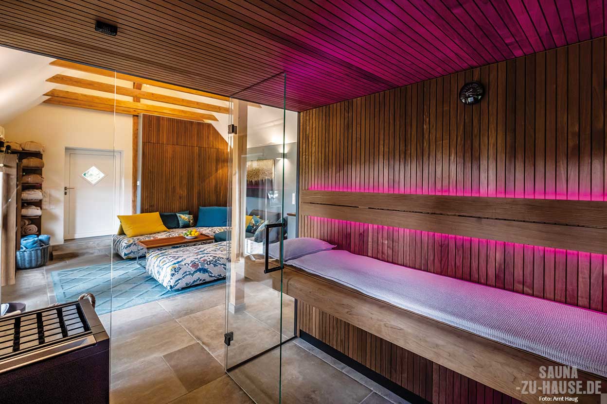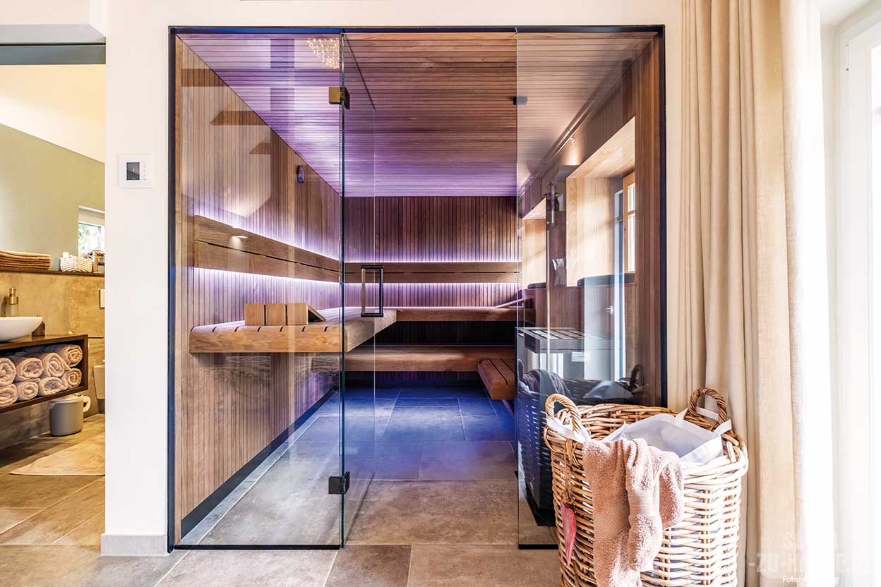 Von der ursprünglichen Planung mit einer schlichten Glastür und versteckten Rigipsverkleidungen ist nichts übrig geblieben. Stattdessen thront die neue Sauna nun als architektonisches Statement in dem einstigen Stall: großflächige Glasfronten, rahmenlos und lichtdurchflutet, kombiniert mit schwebenden Sauna- bänken, die den Raum noch offener wirken lassen. „So haben wir es uns immer gewünscht“, schwärmt die Bauherrin. „Geradlinig, modern, aber trotzdem gemütlich. Die Lichteffekte sind einfach fantastisch.“