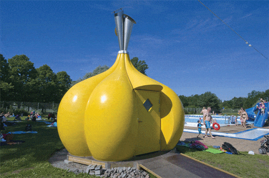 „Der Tod steht ihr gut“ wäre wohl ein passender Name für die Saunaskulptur „Wellness Skull“ von Joep van Lieshout. Der niederländische Künstler zeichnet ein makabres Bild des heutigen Gesundheitskults: „Die Freizeitindustrie ist der wichtigste Markt innerhalb unserer heutigen Gesellschaft. Allmählich verliert der Glaube jede Bedeutung und wird durch eine alternative ‚Selbsterfahrung‘ durch Reisen, Sport und Wellnesscenter ersetzt.“ Van Lieshouts humorvolle Deutung des Vanitas-Symbols verbindet zwei scheinbare Gegensatzthemen in einer Skulptur: Er entlarvt übertriebenen Wellness-Wahn als Kampf gegen die Vergänglichkeit des menschlichen Körpers und den Verlust des Glaubens. Nirgendwo anders als im Zentrum von Wien, der Stadt mit dem wohl sehnsüchtigsten Verhältnis zum Tod, starrte der Totenschädel Wienern wie Touristen an. Leider ging die öffentliche Ausstellung bereits 2009 zu Ende, nichtsdestotrotz darf die Skulptur ganz oben in die Riege der skurrilsten Saunen gereiht werden. Der überdimensionale Totenkopf ist viereinhalb Meter hoch und sechs Meter breit – und wäre theoretisch funktionstüchtig. Immer wieder steigt Dampf aus den Augenhöhlen, wenn die Anlage in Betrieb genommen wird, jedoch nicht zur Nutzung, nur zum Betrachten gedacht. Im Schädel befindet sich alles, was man von Spas kennt: Im Hals gibt es ein kleines Bad mit Whirlpool, vorne im Schädel findet sich die Sauna.