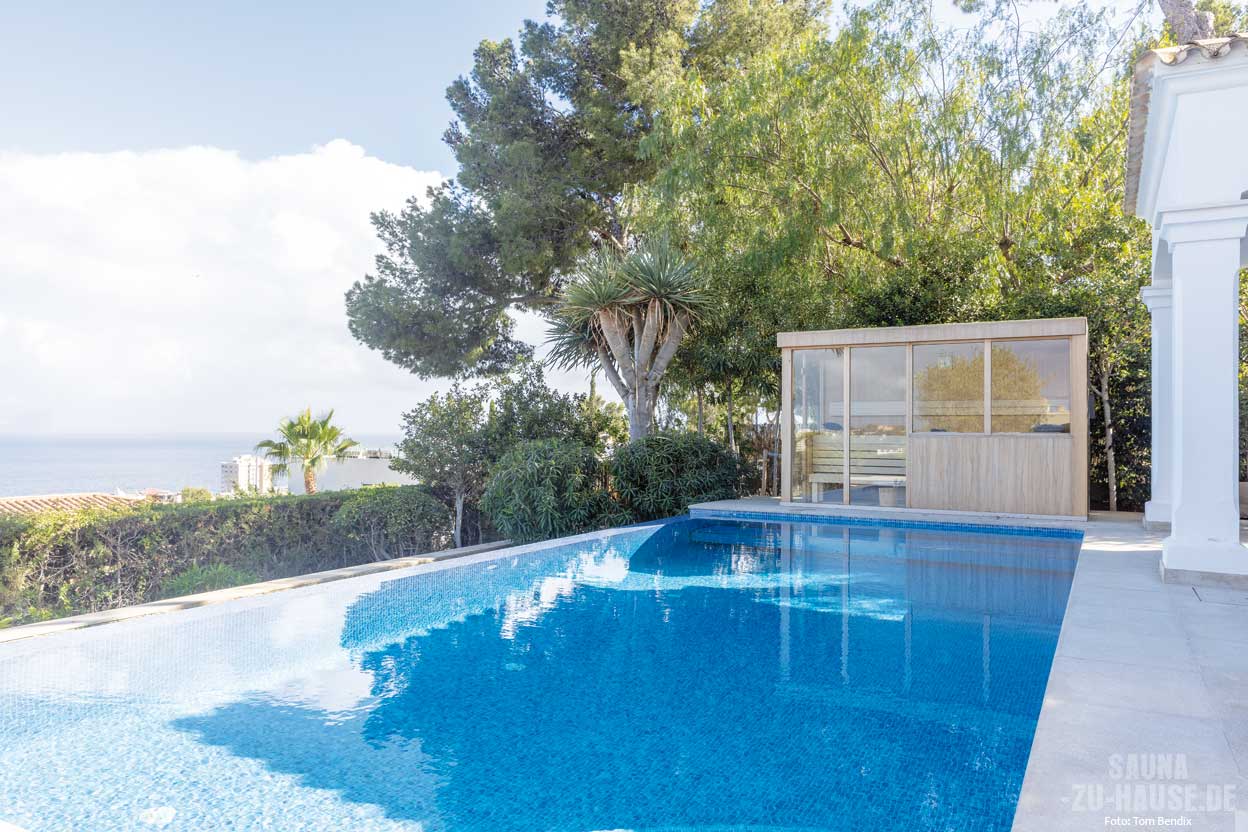 Individuell geplant und mit Liebe zum Detail umgesetzt: Wie eine lichtdurchflutete, maßgefertigte Outdoor-Sauna mit viel Glas und einzigartigem Design eine exklusive Villa mit Pool in ein Entspannungs-Eldorado verwandelt.