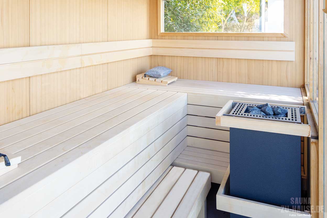 Im Inneren der Sauna wurde ein freistehender Ofen von Eos installiert, der nicht nur für wohlige Wärme sorgt, sondern auch durch sein elegantes Design besticht. Die geraden Linien der Holzpaneele schaffen eine ruhige und entspannende Atmosphäre. Hier kann man den Alltag hinter sich lassen.