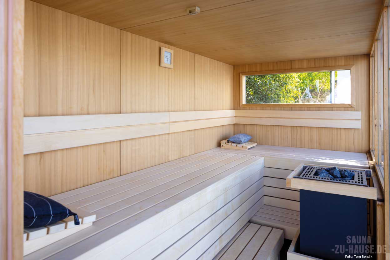 Viel Tageslicht flutet durch die großen Fenster der Sauna, was den Innenraum hell und offen erscheinen lässt. Hier finden die Bauherren, ihre Familie und Freunde einen Ort der Ruhe und Entspannung. Egal ob alleine, um in Stille die Wärme zu genießen, oder gemeinsam mit lieben Menschen – diese Sauna bietet für jeden Anlass den passenden Rahmen.