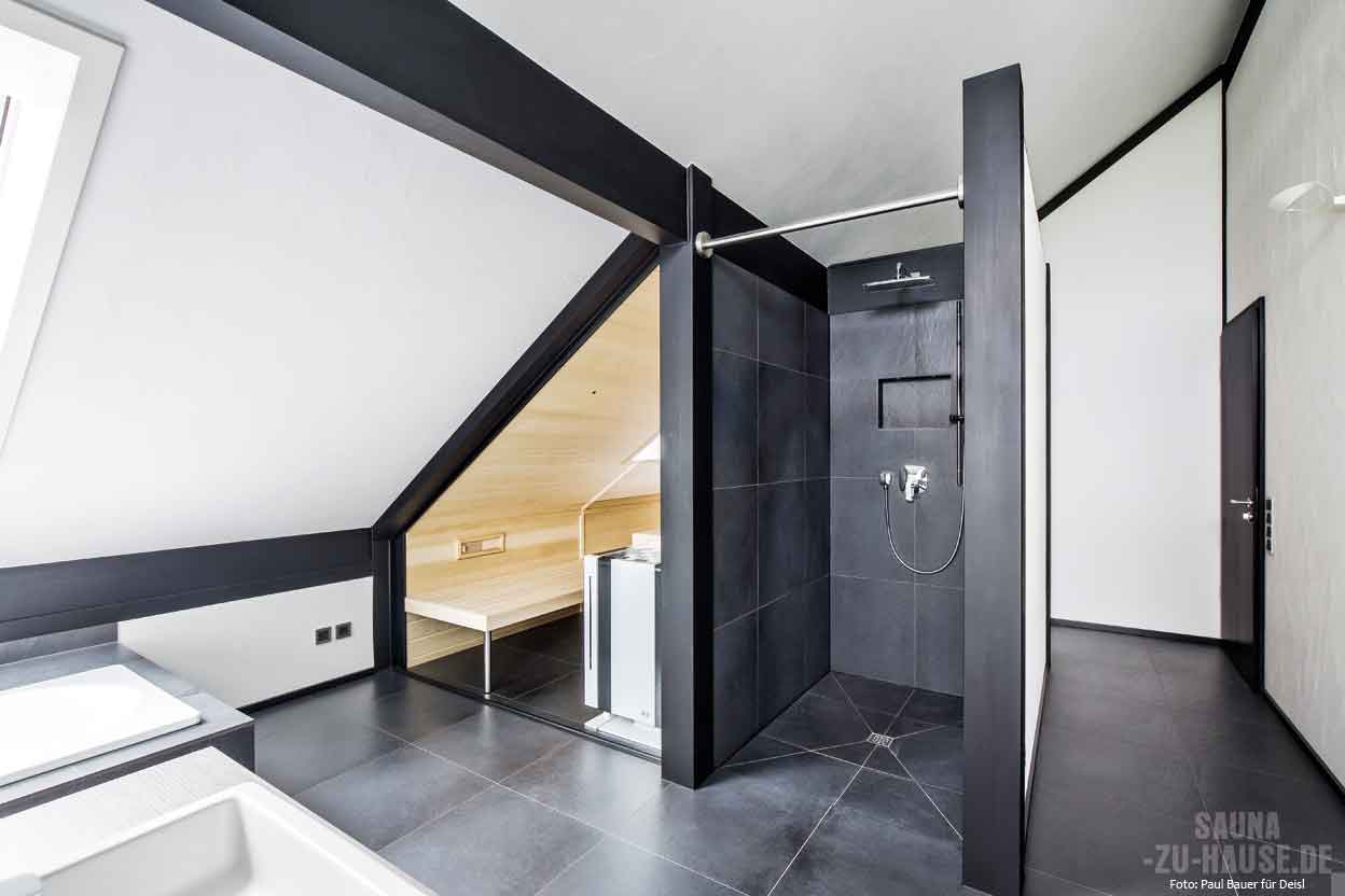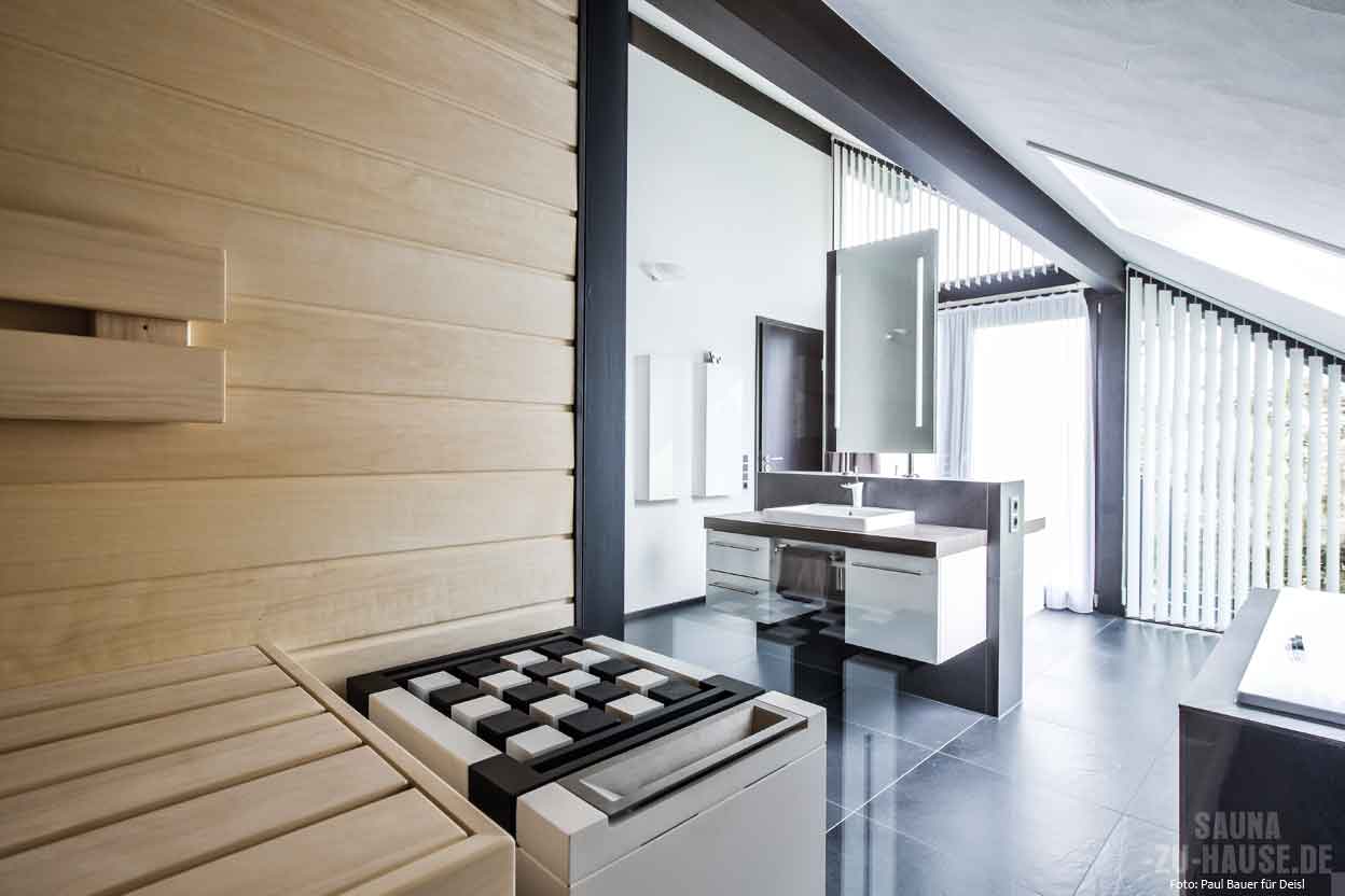 Die mit der Planung und Umsetzung der Sauna beauftragten Profis von Deisl aus Österreich traf das Paar auf der Messe Heim + Handwerk in München, und beide Parteien merkten sofort: Hier stimmt die Chemie. „Die Sauna sollte formal stimmig in das Badezimmer eingefügt und direkt unter der Dachschräge verbaut werden. Darüber hinaus wünschten sich die Bauherren eine offene Gestaltung sowie eine große Panorama-Giebelverglasung, durch die man ins Bad schauen kann“, fasst Saunabauer Josef Deisl die konkreten Wünsche zusammen. Damit die maßangefertigte Kabine den Stil des gesamten Hauses stringent weiterführt, entschied man sich für eine Reduzierung der Farbakzente auf Schwarz und Weiß.