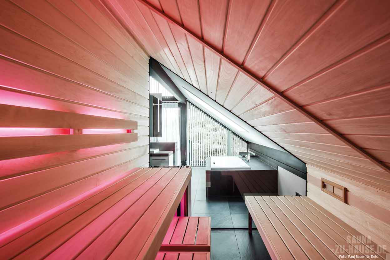 Welch wichtige Rolle Flexibilität und Individualität im Zusammenhang mit dem Saunabau spielen, zeigte sich bereits bei der Planung. Da ein Hinterwandofen nicht in Frage kam, der Standofen nicht flexibel positioniert werden konnte und darüber hinaus die steile Dachschräge den Saunaraum minimiert, musste das Profiteam eine Lösung finden. Eine einseitige, deutlich breitere Lounge-Liege wird einfach mit einer an den Ofen anschließenden, etwas erhöhten Liege kombiniert. Der Clou: Das modulare Banksystem ermöglicht ein müheloses Zusammenbauen der ganz persönlichen Saunalandschaft, indem mehrere Saunahocker versetzt und beliebig gestapelt werden können.