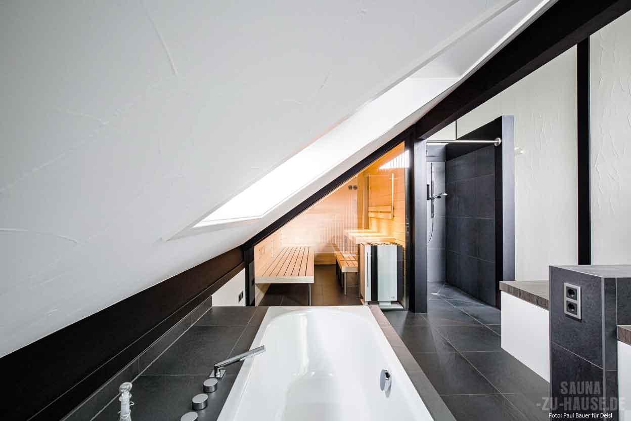 Individuell geschnittene Räume verlangen clevere, maßgeschneiderte Lösungen. Passend zur zeitgemäßen Optik ihres neuen Hauses wünschte das Ehepaar aus Süddeutschland sich eine eigene Sauna für das geräumige Wellness-Bad.