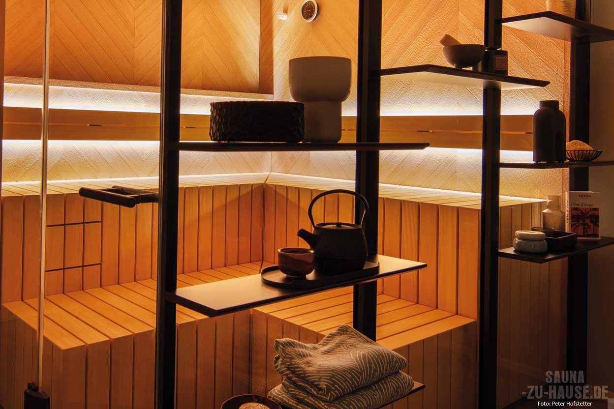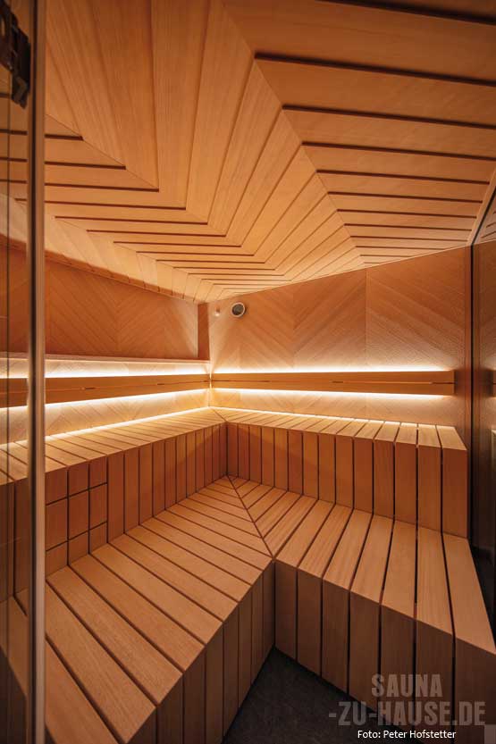 unterstreichen das harmonische Gesamtkonzept. Charakteristisch für die Sauna „Gesa“ ist zudem ihre eindrucksvolle Decke mit 3-D-Fischgrätmuster, das in aufwendiger Handarbeit hergestellt wird und ihr eine skulpturale Optik verleiht. Ergänzt wird das luxuriöse Saunaerlebnis durch den hochwertigen „Bonatherm“-Unterbankofen und die benutzerfreundliche Steuerung „21029 T“.