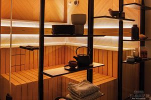Die Innenverkleidung aus Hemlock mit einer Holzprägung in Yakisugi-Optik und die zweistufige Liegeeinrichtung aus Abachi geben zudem ein stilvolles Kontrastspiel zur schwarzen Umrahmung ab und