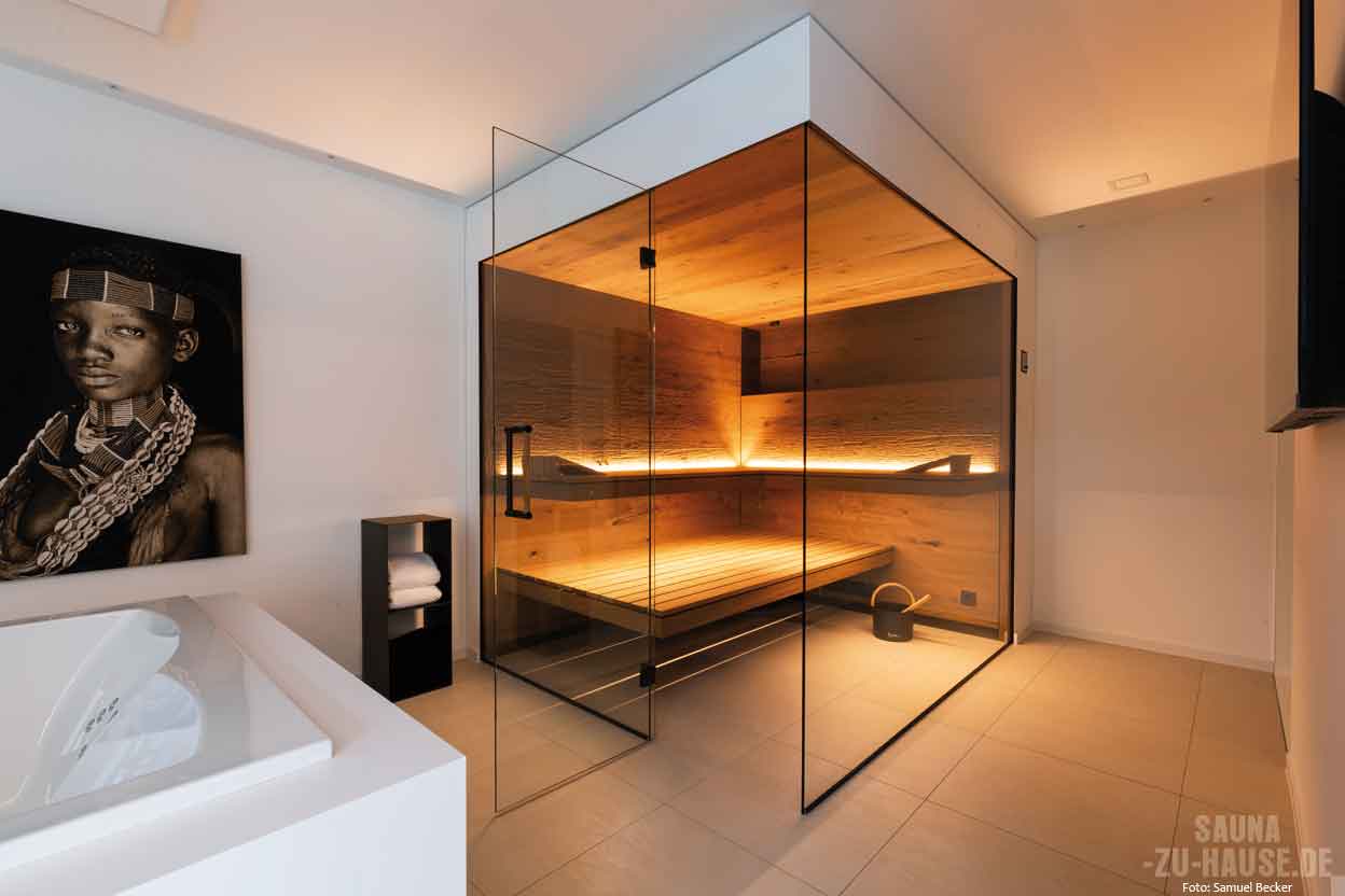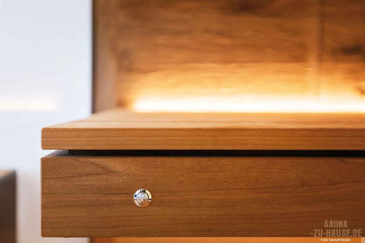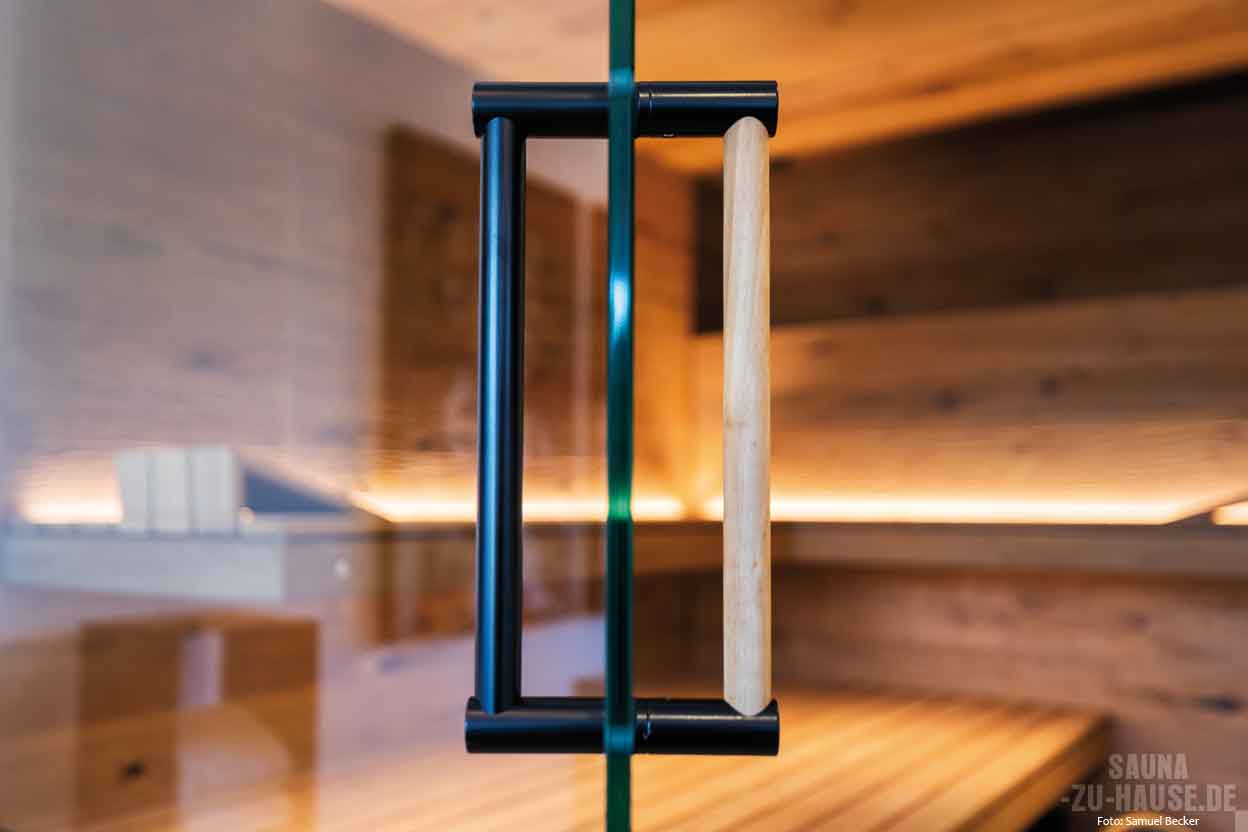 Eine weitere Besonderheit, worauf die Bauherrin Wert gelegt hat, ist das Weglassen der kompletten Rückenlehne. Beide Saunagänger nutzen die Sauna hauptsächlich im Liegen oder nach vorn gebeugt, sodass auf die Lehne verzichtet werden konnte. Der in die Rückwand integrierte Infrarotstrahler konnte somit komplett unsichtbar untergebracht werden. Lediglich bei Benutzung des Strahlers werden die Flügeltüren geöffnet. Wichtig war der Bauherrin außerdem die Positionierung der Ecksauna in der Raumecke mit der zweiseitigen Verglasung, um beim Saunieren aus der Kabine den Ausblick in den Garten genießen zu können. „Besonders begeistern mich immer wieder die schwebenden Bänke, weil dadurch kein Pfosten oder ähnliches den Blick nach draußen stört.“