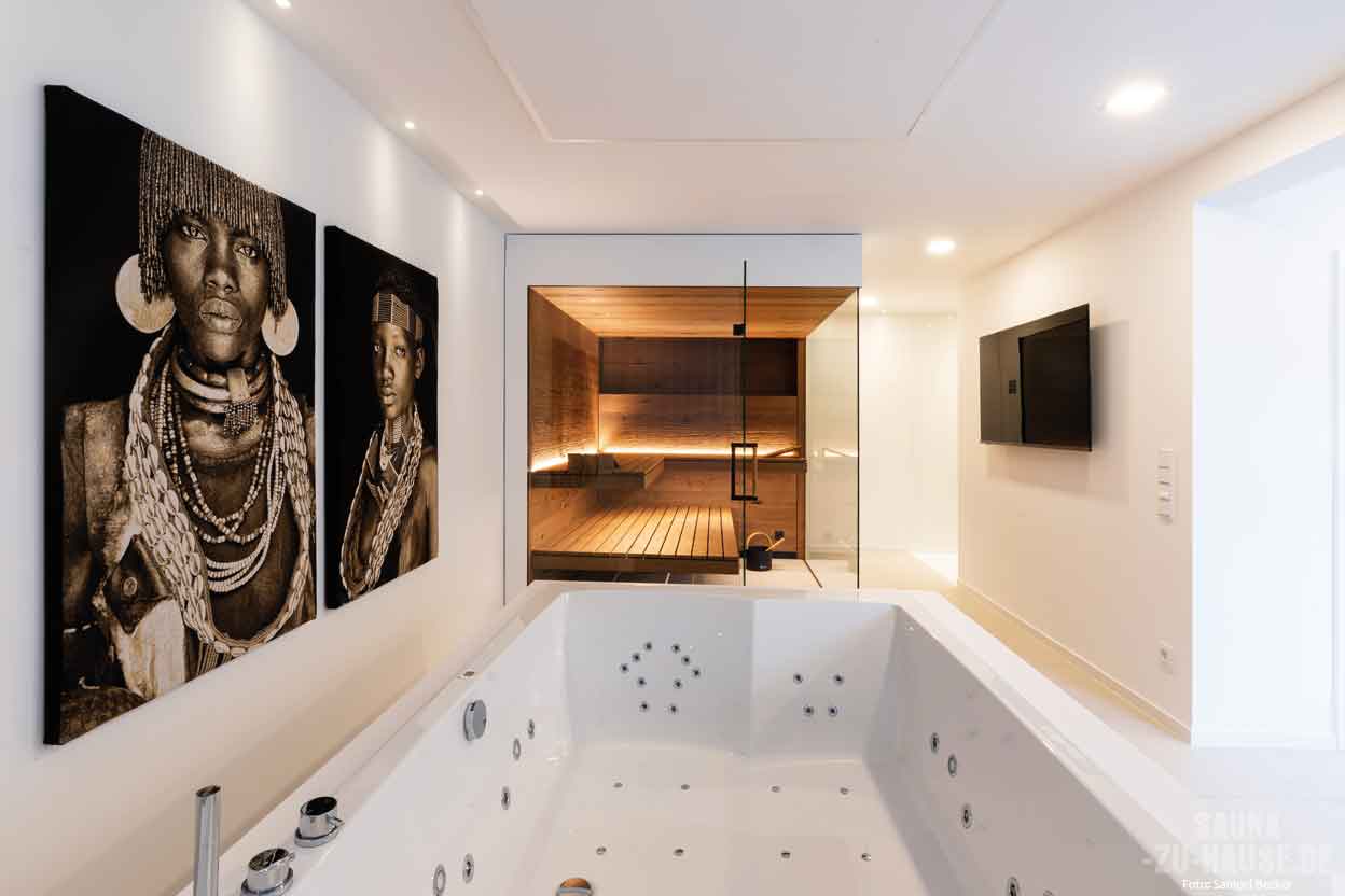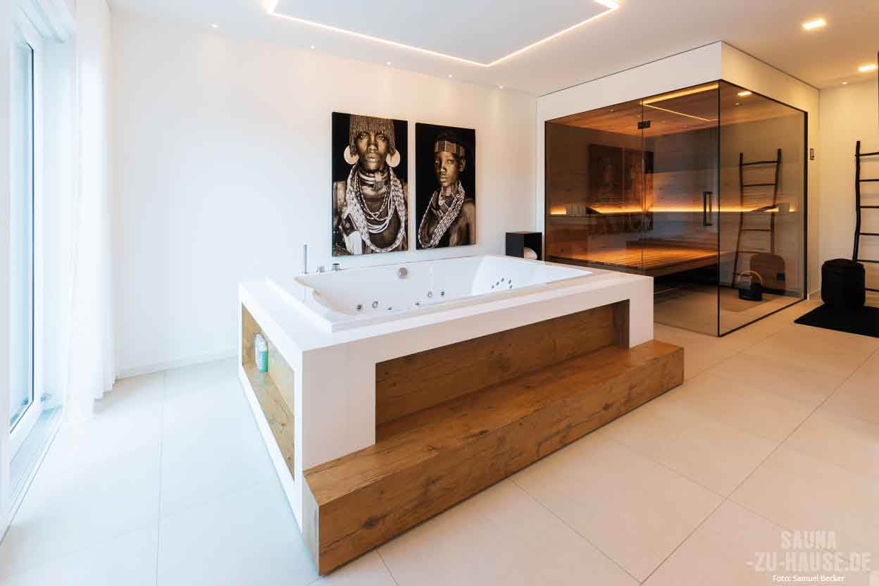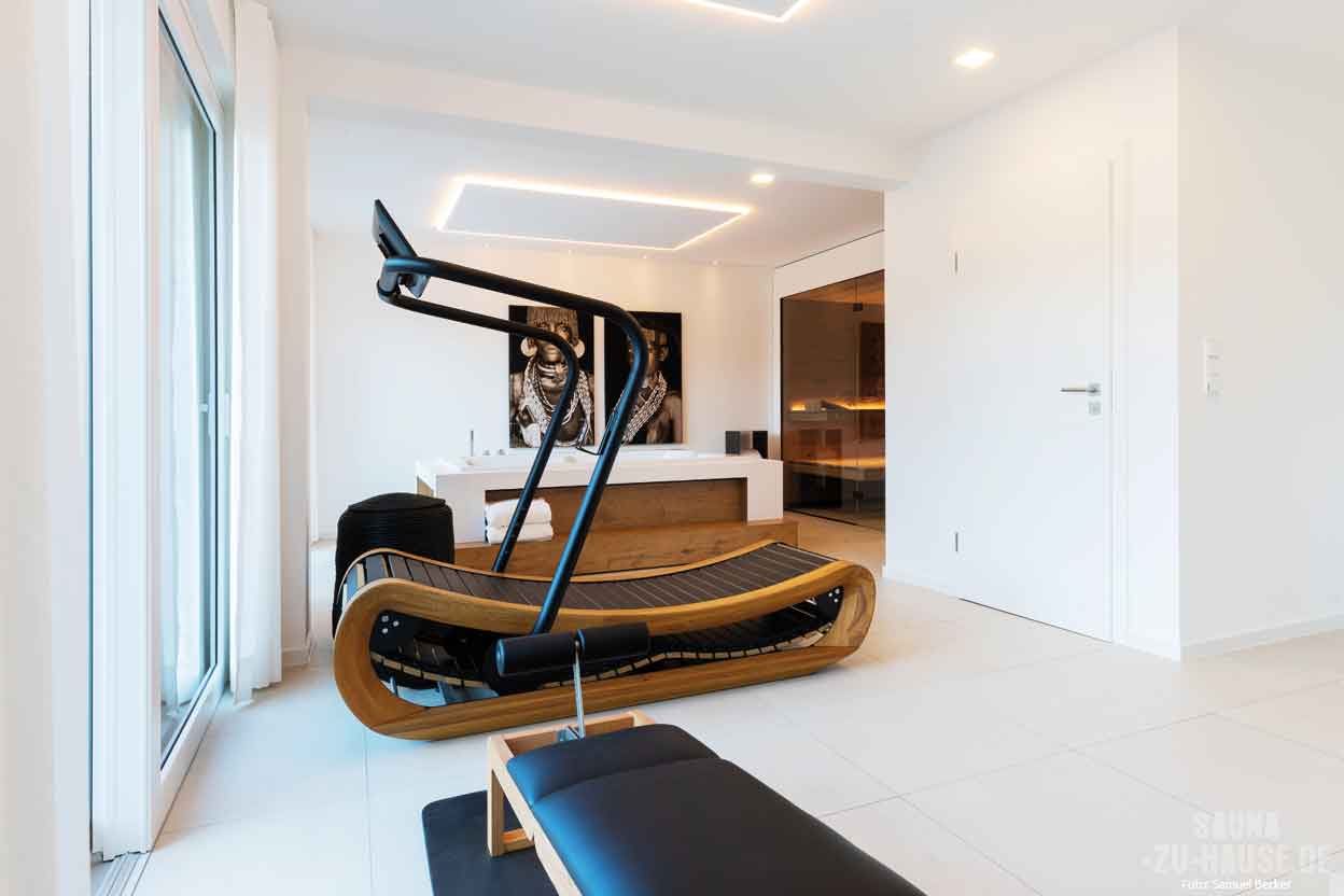 Dann entstand die Idee, den nicht mehr zwingend benötigten Garagenraum komplett umzugestalten. Das Ziel dabei war, möglichst viel der vorhandenen Strukturen beizubehalten: Das Garagentor sollte durch eine Glasfront ersetzt und ein zusätzlicher Durchbruch geschaffen werden, um weitere Fensterelemente einzubauen. Das Ergebnis ist ein lichtdurchfluteter, sehr heller Sport- und Wellnessbereich mit Laufband, frei stehender Whirlwanne und einer Ecksauna mit zweiseitig verglaster Front.