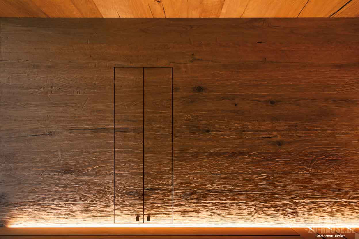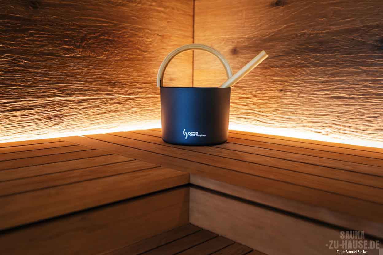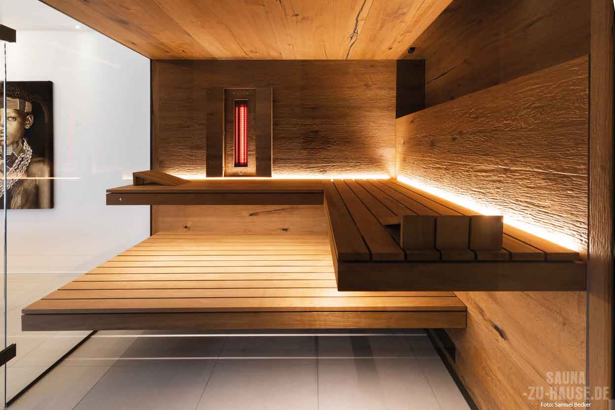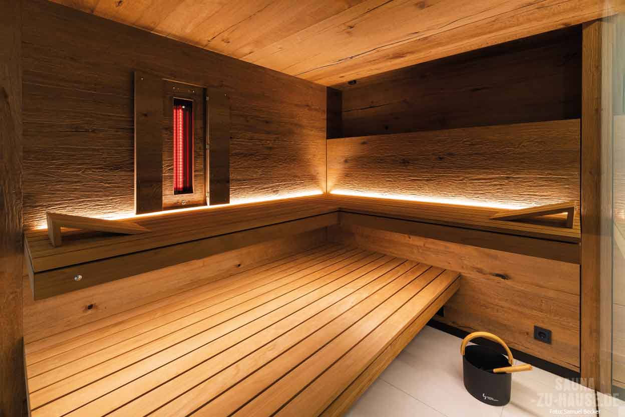 Das gesamte Ambiente ist modern und freundlich gestaltet. Die optimal aufeinander abgestimmten Holzelemente in Eiche ziehen sich als roter Faden durch die gesamte Gestaltung und sorgen damit für eine gemütliche Atmosphäre. Die Inneneinrichtung der Sauna in Eiche-Echtholzfurnier mit strukturierter Oberfläche erzeugt eine spannende, urige Optik und sorgt gleichzeitig durch die Oberflächenvergrößerung für ein optimales Saunaklima. „Mir war es wichtig, dass der Saunaofen nicht sichtbar ist, sodass wir uns für einen Hinterwandofen entschieden haben, der hinter der Saunawand versteckt ist. So wollte ich vermeiden, dass unsere Kinder ständig aufpassen müssen, sich nicht am Saunaofen zu verbrennen.“