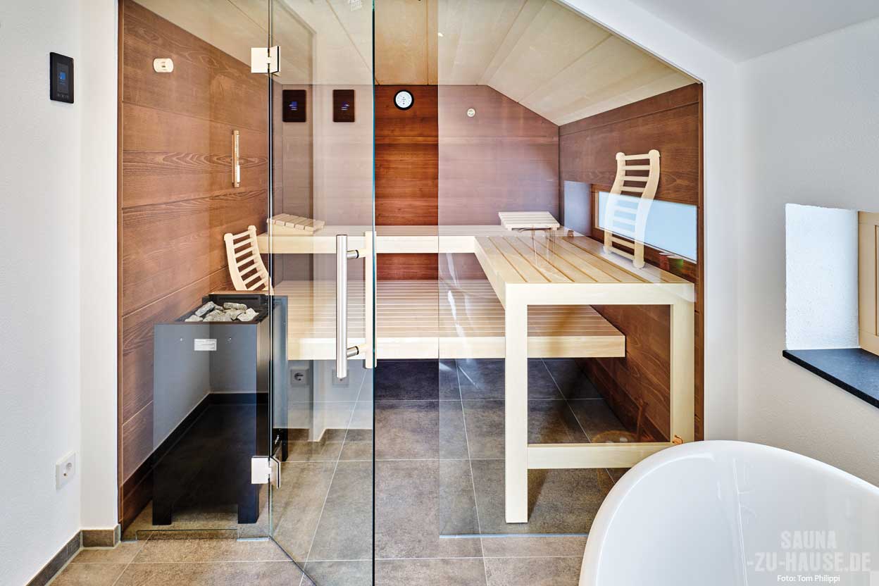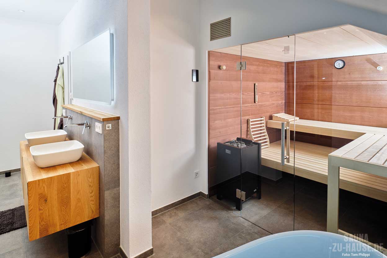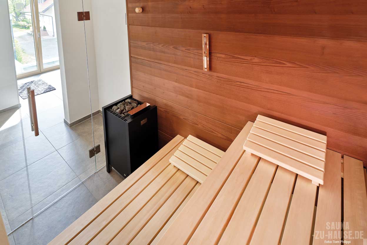 Eine Sauna ist für uns eine wunderbare Möglichkeit zur Erholung und fördert gleichzeitig die Gesundheit. Die Wärme und das beruhigende Ambiente helfen, Stress abzubauen und die Muskulatur zu entspannen“, begründet der in der IT- und Finanzbranche tätige Bauherr, warum bei der Planung seines Hauses eine Sauna nicht fehlen durfte. Die Vorzüge des gesunden Schwitzens hatte das Paar bereits im Wellness-