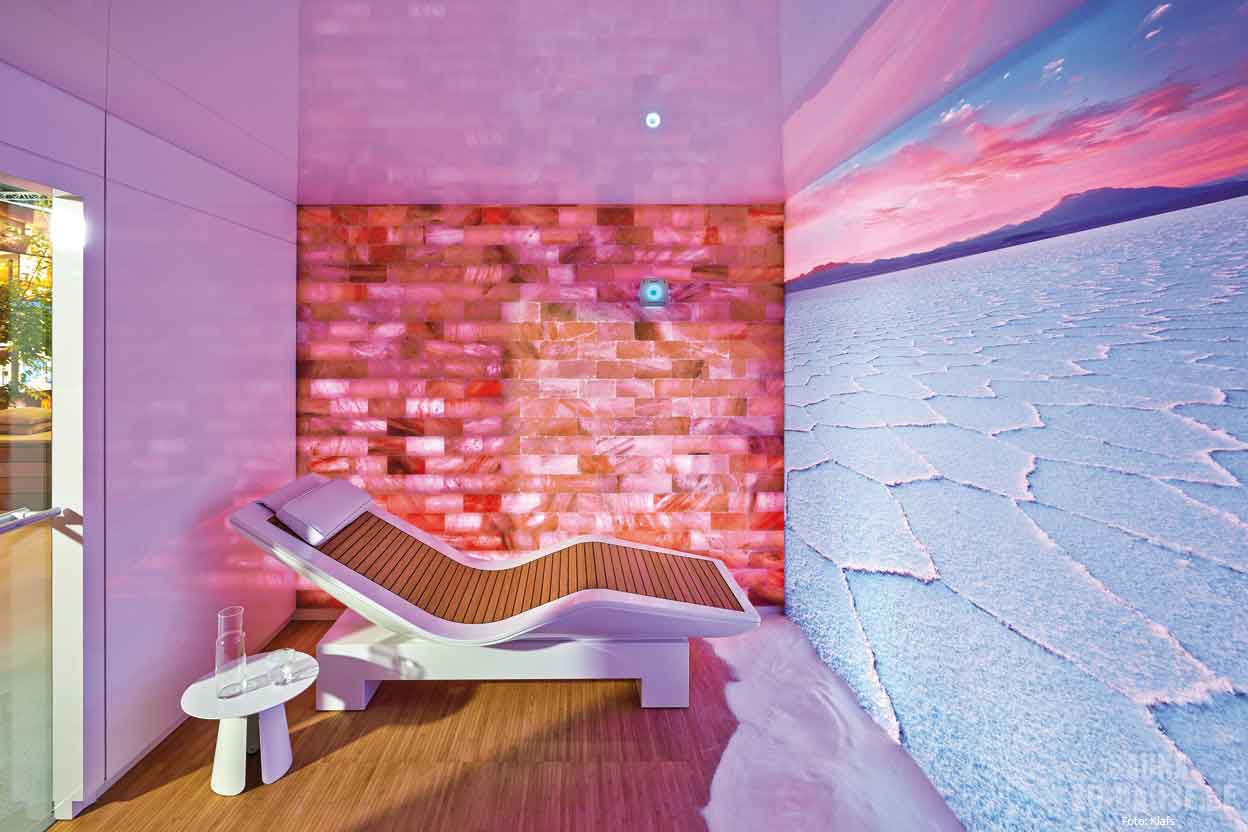 Raffiniert: Der Sauna-Hersteller Klafs aus Schwäbisch Hall hat in diesem Kontext eine innovative Technologie entwickelt, die sich Microsalt nennt. Hierbei verteilt sich fein gemahlenes Trockensalz in der Kabine. Beim Einatmen dringen die feinen Salzpartikel in das gesamte Atemwegssystem ein – von der Nase in die Nebenhöhlen, den Rachenraum bis in die äußersten Lungenbereiche – und können hier schleimlösend wirken. Die Anwendung von Microsalt bezweckt eine gründliche Reinigung der Luftwege bis in die feinsten Lungenbläschen sowie die Säuberung und Revitalisierung der Haut. Regelmäßige Inhalationen können zudem das Immunsystem unterstützen. Microsalt empfiehlt sich besonders bei Heuschnupfen, Asthma, Bronchitis, Mukoviszidose oder chronischen Lungenerkrankungen. Auch bei Menschen, die häufig unter Erkältungsbeschwerden leiden, die mit Stirnhöhlen- oder Nebenhöhlenentzündungen zu kämpfen haben, sowie Menschen mit Hauterkrankungen, Schlafstörungen oder Depressionen kann Microsalt eingesetzt werden. Mit dem neuen handlichen und akkubetriebenen „Saltpro-X“-Gerät hat Klafs es geschafft, die Microsalt-Technologie auch für private Haushalte ganz einfach zugänglich und erschwinglich zu machen.